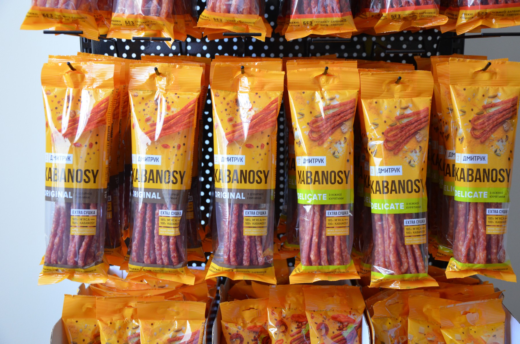 «Будь-який ковбасний виріб перебуває в оболонці – вона або натуральна (свинна, яловича, бараняча), або штучна. Проте виготовити продукт меншим в діаметрі, як 18 міліметрів, неможливо. Наші кабаноси значно вужчі, а для їхньої оболонки ми використовуємо альгінати – екстракти натуральних бурих водоростей, які дають можливість сформувати виріб будь-якої товщини», - розповів керівник відділу маркетингу компанії «Дмитрук». KABANOSY – продукт, що виготовляється тільки з охолодженого м’яса та фасується у зручні упаковки вагою у 50 та 120 грамів. Продукт цінний ще й тим, що не містить глутамату, глютену, фосфатів та барвників.